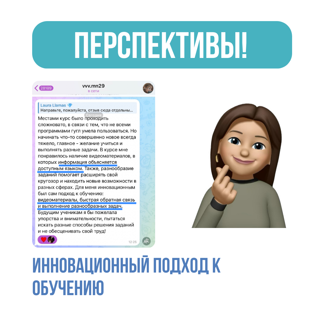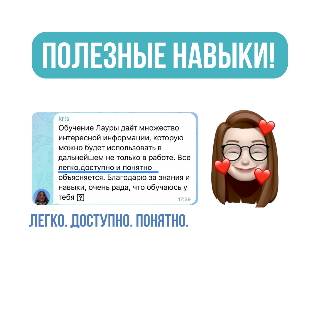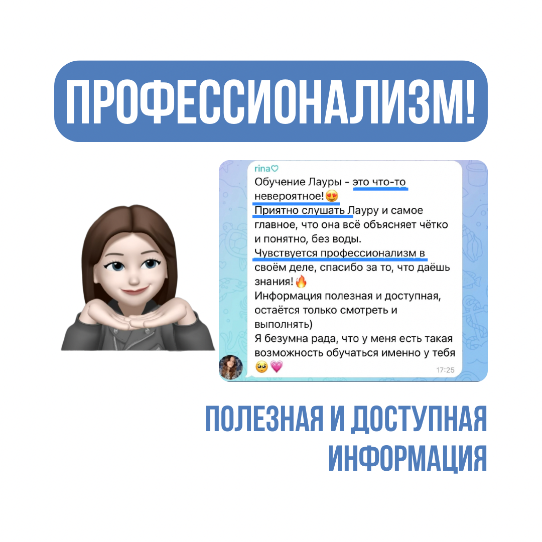 • более 20 информационных видео без воды • всего лишь 5 дней на обучение, 5 модулей • проверка заданий лично Лаурой • 1 новая онлайн профессия • 1 диплом о прохождении на русском и английском языках • помощь при трудоустройстве • доступ к курсу на год и к закрытому чату выпускников